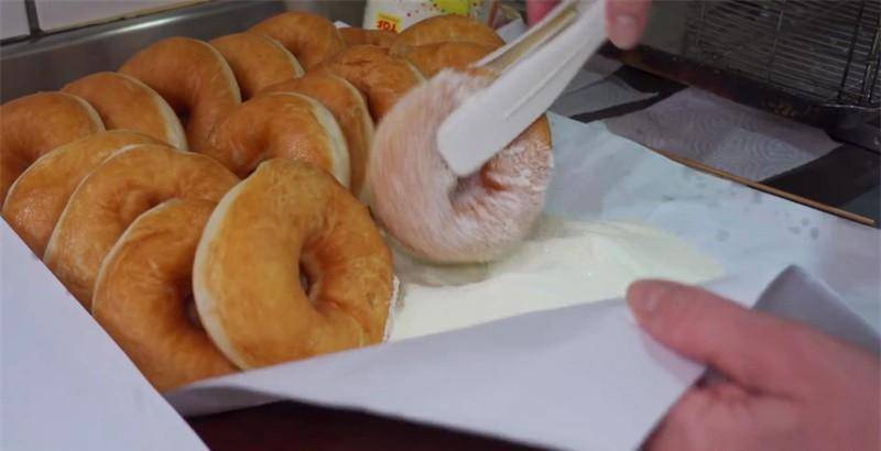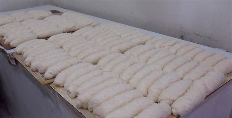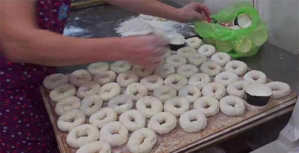取出小剂子,用擀面杖擀平后顺势卷起来,做成拇指大小的长形小柱条,把弄好的小柱条用手搓成20厘米左右的长条,然后卷起来做成一个圆圈,把两头用力捏紧,这样一个圆圈形状的造型就做好了。因为长期制作,工人的速度很快,一会功夫就做好了几十个,把做好的圆圈用薄膜盖住防止干掉,所有的小圆圈都做好了,就可以开炸了。