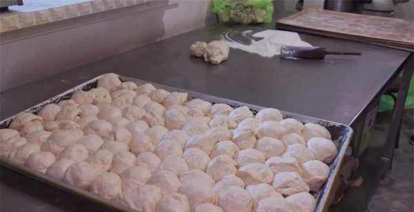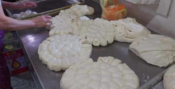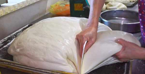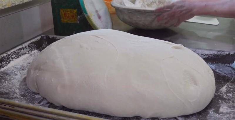 每天到店后员工都先把面粉加入打面机里边打发好,打好的面团从打面机里边取出,放置在专用的大盘里,在表皮稍微抹上适量的干面粉,放置面团里是水分渗出让面团粘贴在盘子上,然后盖上塑料薄膜,让面团发至一倍大,然后打开薄膜,继续抹上适量干面粉拍打面团,把对团对着揉搓,再继续对折揉搓,把整个面团揉搓折叠成一个大团子,盖上薄膜继续让面团发酵,等面团二次发酵完,就可以开始制作小吃了。