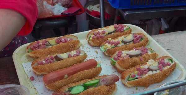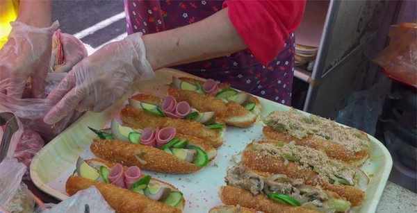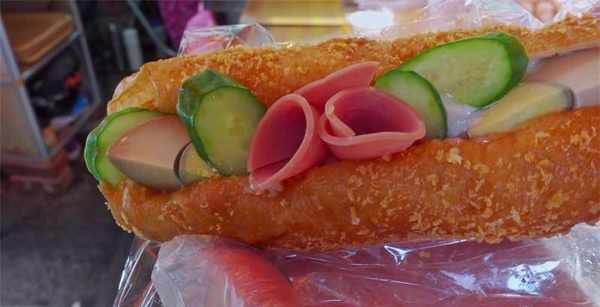 把炸好的小吃捞出控干油,然后从中间把条状小吃切开,从切开的位置把青瓜片、炒制过的肉丝馅塞入小吃里,还有其他的馅料,比如花生碎、香肠、生菜、卤蛋、玉米、奶酪等等,可以根据顾客的口感喜好添加,最后再涂上酱料,再用食品包装袋装好封口就可以了,也称之为中式汉堡。