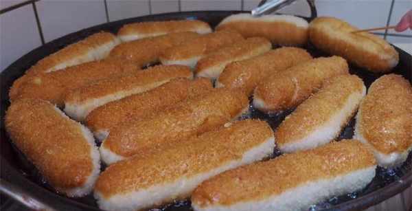 接下来做第二个品种,在之前搓成小条状的面团表皮抹上少许的水,然后放入面包糠中,给每一个面团上都裹上面包糠,然后下入油锅中油炸,炸的过程中记得不停的翻面,防止同一面炸糊掉了,通过油炸的小条状膨胀变大了,表皮也金灿灿的,大老远就能闻到香味。