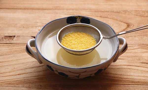 小米淘洗干净后,用清水浸润着备用。浸泡小米的水不要丢掉,稍候我们用来打小米糊。