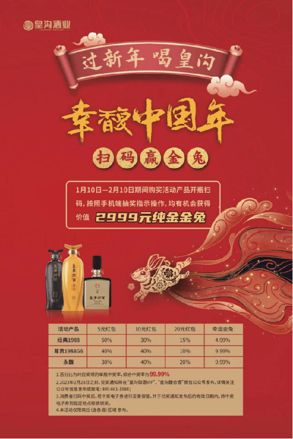 在抖音、视频号等热门短视频平台,皇沟酒业通过联动网红大V的自身流量,与消费者同屏互动,提高了皇沟和豫酒的声量。于市场层面,皇沟酒业在郑州、周口、商丘大本营等地悬挂了十万个大红灯笼,营造了春节氛围;结合当地特色民俗和庙会,营造了品牌氛围;推出“过年喝皇沟,扫码赢金兔”开瓶扫码活动,仅一天时间,消费者通过开瓶扫码,便有6只纯金金兔中奖,一系列市场组合拳在营造了消费氛围的同时,更拉动了产品的动销火爆,。
