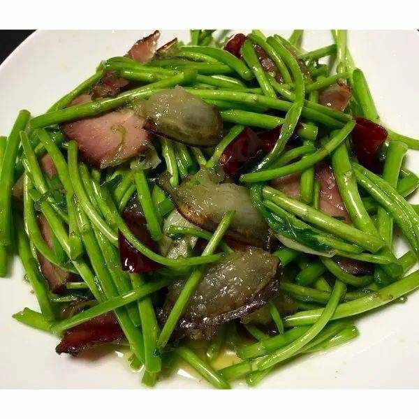5 加入切好的茼蒿杆拌炒,火要大,温温的火菜会黄