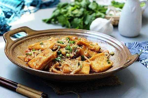 3 豆腐、金针菇在水中泡2分钟后沥水,豆腐切成小块。