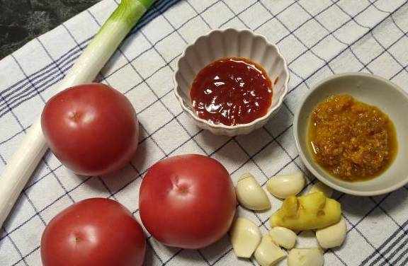 材料:番茄3个,番茄酱,姜,蒜,大葱,黄灯笼酱(不吃辣味的可不加),芹菜,香菇