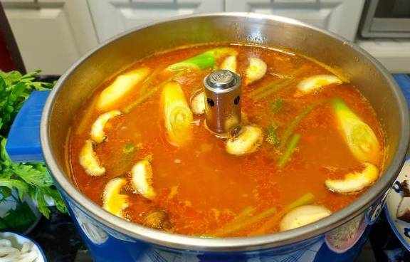 然后将煮好的番茄锅底过滤到火锅盆中,放上香菇,芹菜段,大葱,煮开就可以涮火锅了!