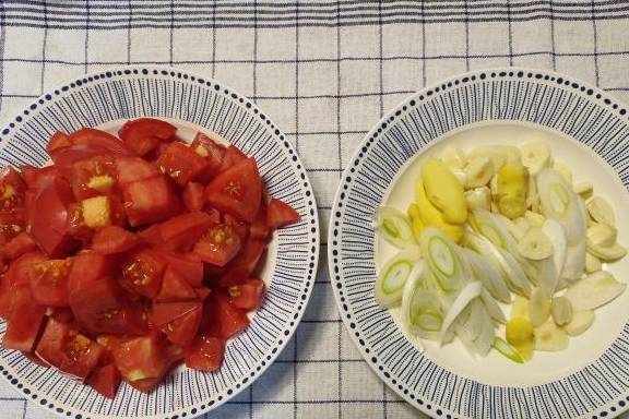 首先处理汤底配料:番茄洗净切丁,生姜,大蒜切片,大葱切斜片