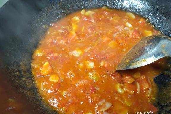 接着放入番茄块翻炒几分钟,直到番茄出沙变烂,加入黄椒酱1勺,番茄酱2~3勺,翻炒出香辣味