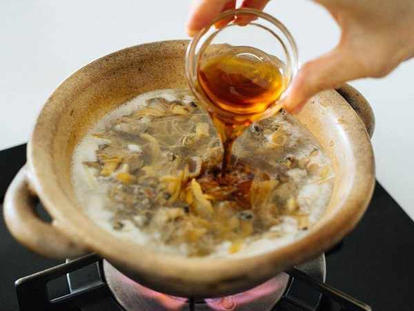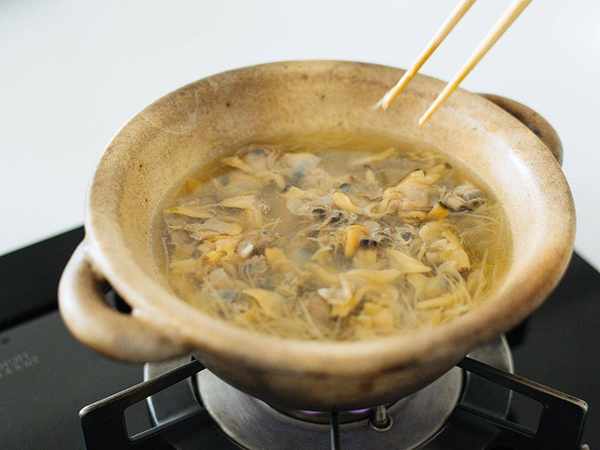 1、在锅中煮开A,将蛤肉连同汤汁一起加入。用中火迅速煮开,待汤汁只剩一半时,转小火加入B。