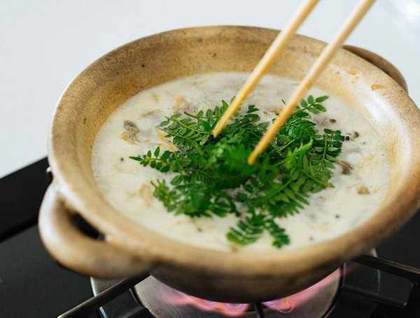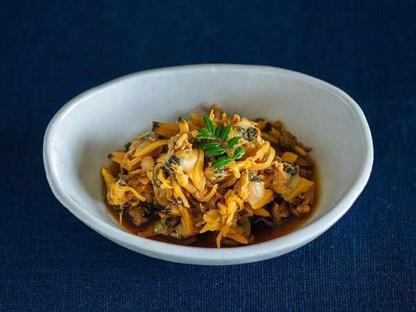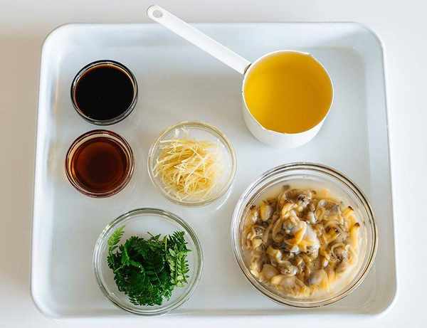 向料理家松田美智子女士请教了海味煮蛤蜊的做法。把新鲜的蛤煮得咸甜可口,配上生姜和树芽,风味十足。这是一道菜,可以尽情享用富含营养的蛤仔。