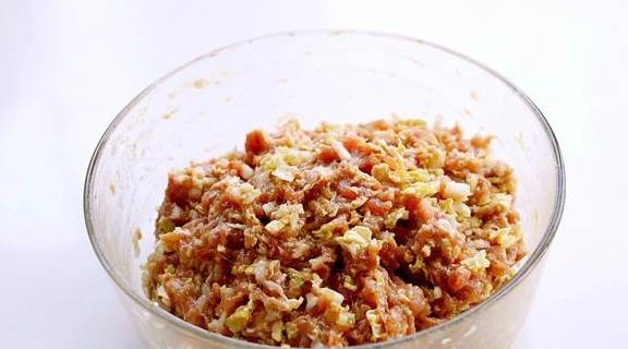4、一切准备工作就绪后,把肉馅儿与白菜拌匀即可。盐是提前加在肉馅儿里的,白菜放进去后,准备工作就绪后再拌匀白菜,免得白菜出水。这样白菜的营养也丝毫不会流失。