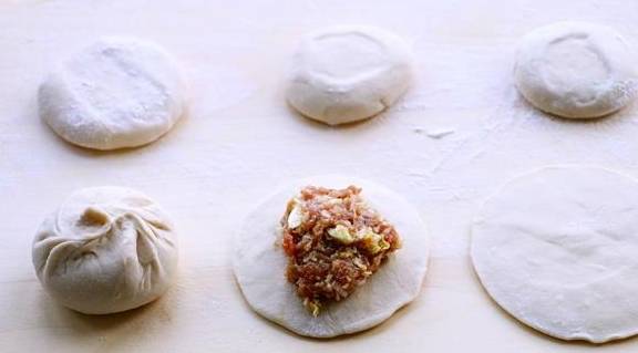 6、面松弛好以后取出放案板上,用点儿干面,稍稍揉一下,分成小剂子,分别擀开,包入馅儿,包成包子形状。