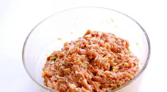 2、二肥八瘦的猪肉剁好后,加点儿盐拌匀,然后慢慢添加花椒水,边加水边搅拌,让肉馅儿充分吃进去,做成水打馅儿;葱姜剁碎,同一点点酱油、香油一起加进去拌匀。