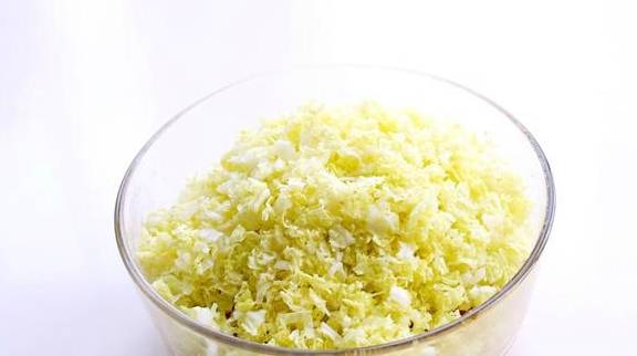 3、然后剁点儿大白菜放进去。剁大白菜时,我没挤出它的水分,这样吃着更营养,而且猪肉馅儿更滋润,当然,前提是白菜不要放太多。