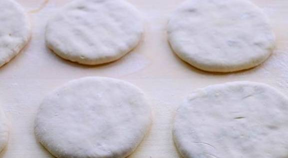 7、收口向下,用手轻轻按扁按薄,两面换着按,不然馅儿会跑偏饼皮会厚。