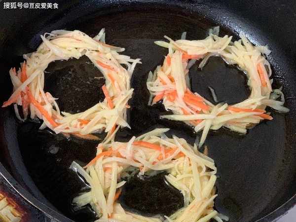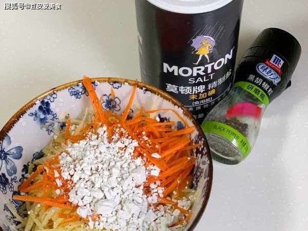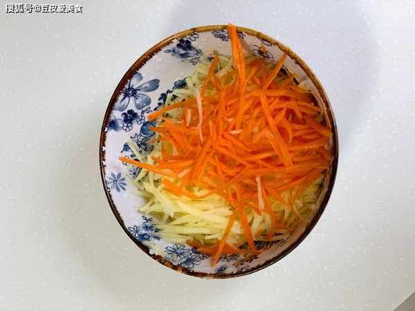 1、土豆去皮,洗净,擦成丝。胡萝卜去皮,洗净,也擦成丝。