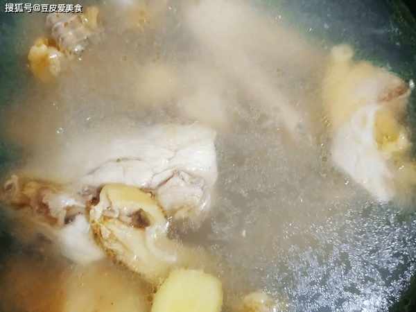 2、鸡肉冷水下锅,下入姜片和料酒,大火烧开后,继续焯煮5分钟,煮出血沫,捞出,沥干水分。
