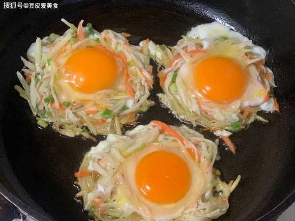 4、小心地把鸡蛋打入土豆丝围成的圆里,如果把握不好,就先打入碗里,再全借力放进去,这样比较不容易扑出来,也不容易烫到手。