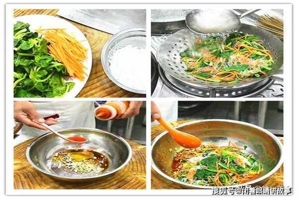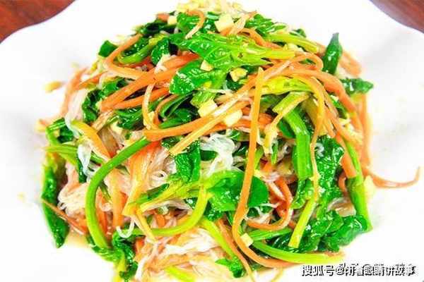 锅内烧水,加入一勺食盐和少许植物油,食盐能够入底味、植物油能防止营养流失。水烧开以后先倒入胡萝卜焯烫20秒,胡萝卜比较难熟要早一点放,再依次倒入菠菜和粉丝继续焯水20秒,焯水还能去除菠菜中的草酸,然后倒出后用凉开水冲洗降温,以免粉丝粘在一起。