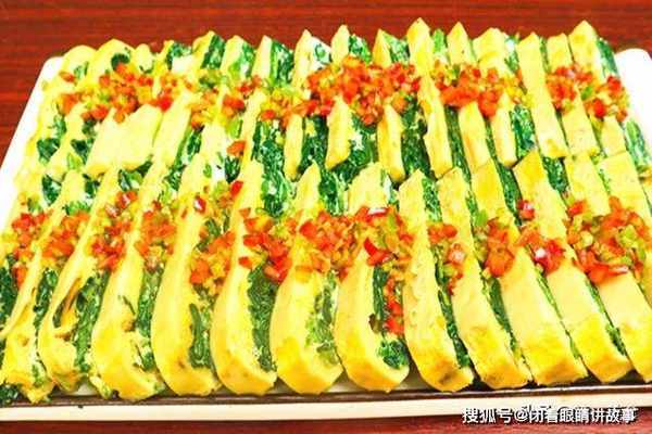 出锅以后倒扣在案板上,切成均匀厚片摆放在盘子里,层层叠叠的鸡蛋包裹着菠菜,翠嫩又鲜香。
