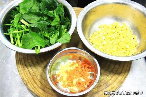 首先,我们准备一股水果玉米,清洗干净后把玉米粒切下来;菠菜一把择洗干净;大葱切成葱花,生姜切成姜丝放在一起;再切一点胡萝卜粒用来配色。