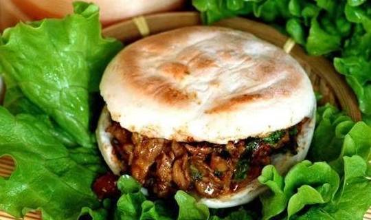 平底锅烧热,不要放油,依次放入擀好的圆饼,小火烙熟就可以了,烙的时候要小心看着,别忘了翻面,烙的时间可以稍微长一些,最好烙至外脆里软。然后把饼从中间剖开,肉剁碎,加青椒、香菜,滴几滴肉汁,好吃的肉夹馍做成啦,真是好吃的不得了。