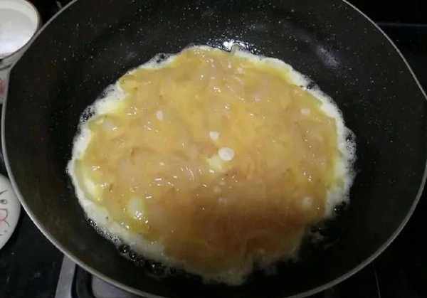 步骤二:将洋葱切块,热油里倒入鸡蛋液等到鸡蛋液块凝固的时候快速翻炒。