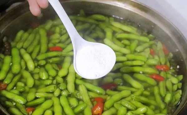 步骤三:加入几滴食用油和加入些许食盐,这里食油为了让毛豆看上去颜色更加亮丽诱人。