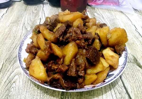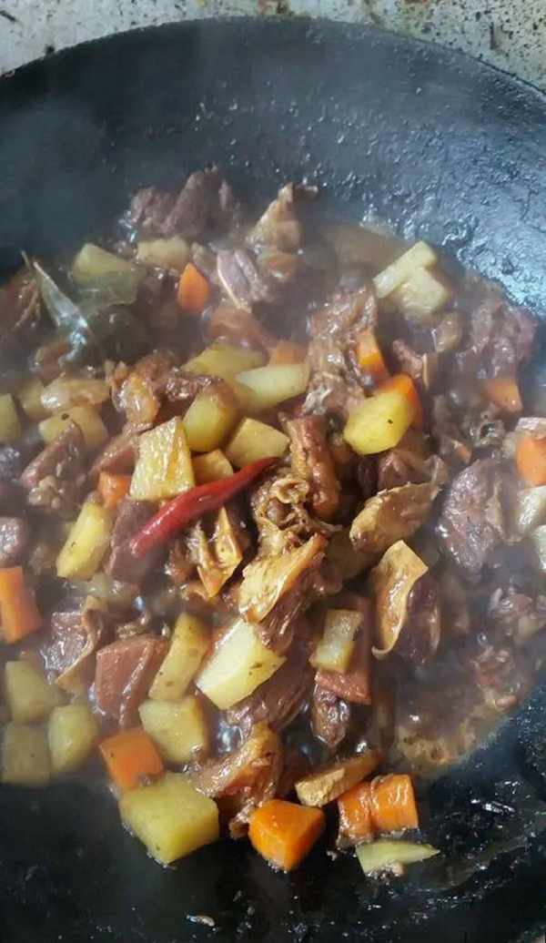 步骤四:将土豆牛肉放进去,改成大火,盖上盖子收汁,最后汤汁变粘稠的时候翻炒几下再加上一点水淀粉勾下芡便可出锅。