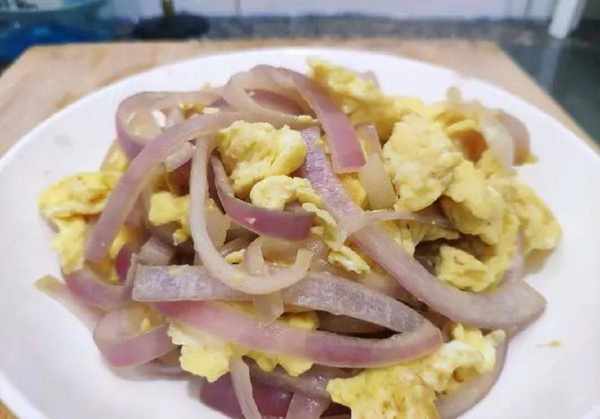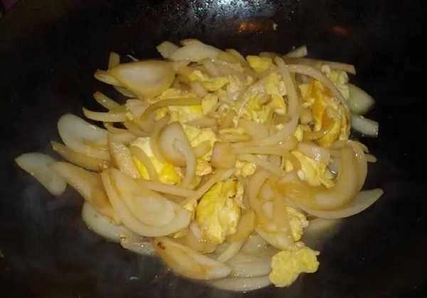 步骤三:等到鸡蛋颜色变深的时候加入洋葱,再加少许盐和一勺老抽上色。等到洋葱稍微变软,这道美味便可出锅。