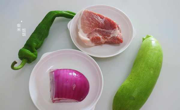 【食材】西葫芦、猪肉、洋葱、青椒、姜、蒜、干辣椒、盐、老抽、淀粉、生抽、香醋、五香粉