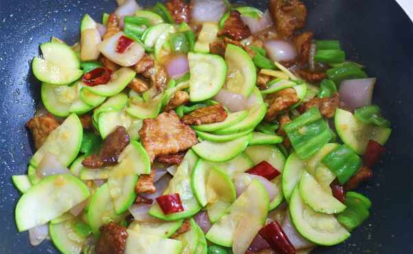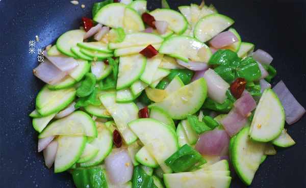 7,倒入西葫芦,开最大火快速翻炒。西葫芦、洋葱、青椒都非常好熟,所以不要炒太长时间。