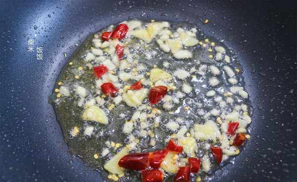 5,锅里再加少许油,放入姜末、蒜末、干辣椒,小火炒出香味。