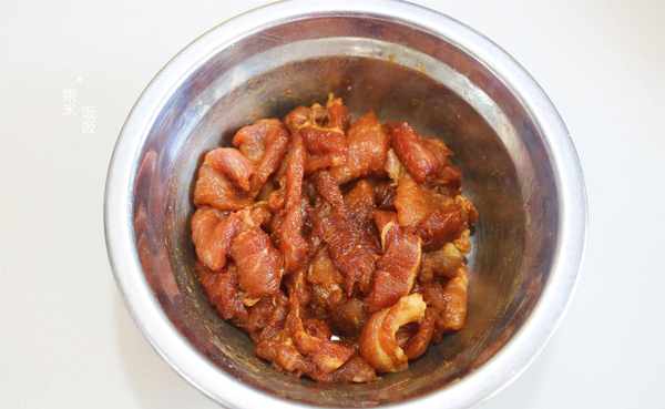 1,猪肉洗净,切成薄片。加少许盐调味,少许老抽上色,抓拌均匀。