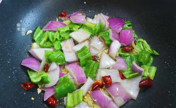 6,倒入洋葱和青椒,大火翻炒几下,炒至青椒变色,洋葱稍稍炒出鲜味。