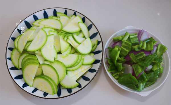 3,西葫芦洗净,对半切开,再切成薄片。洋葱一小半,切成小块。青椒去籽去蒂,洗净后切成块。