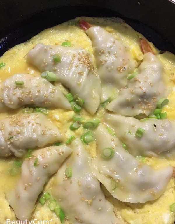 原料:鸡蛋、大虾、饺子皮、葱、芝麻、盐、胡椒粉、食用油、香油、鸡精、酱油等