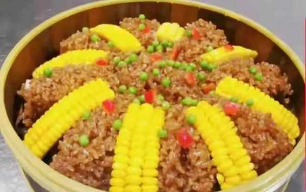 3、泡好的糯米加蚝油、生抽搅拌均匀,再将腌制好的排骨均匀的裹上糯米,放到荷叶上,搭配自己喜欢的配菜。玉米、土豆或者芋头都可以再放入蒸锅。盖盖蒸40分钟即可,糯米蒸排骨就做好了。