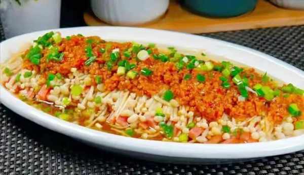 4、锅里水烧开,放入蒸锅,盖盖大火蒸十分钟,蒸至金针菇熟透后取出,再淋上蒸鱼豉油,撒上葱花,最后浇上热油激发香味,就可以开吃了。