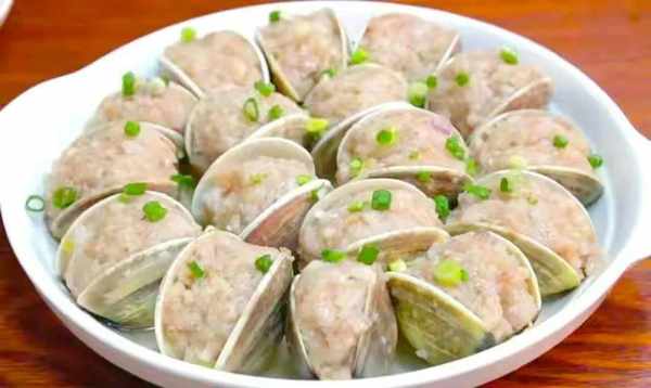 3、然后把调好的肉馅放在花甲里,搞好之后全部摆入盘里,锅里的水烧开将花甲放上去蒸8分钟。蒸好后撒上点葱花点缀,这道花开富贵就做好了。