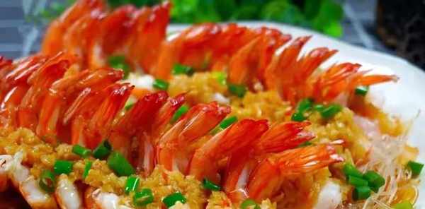 4、热锅放油,倒入蒜末,加蚝油生抽中火炒出蒜香味,然后将蒜蓉放在虾身上,锅里水烧开后放入蒸锅,盖盖蒸三到五分钟,起锅后淋上蒸鱼豉油,撒上葱花,再浇上热油激发出香味就做好了。好看又好吃,过年招待客人必吃的一道菜。