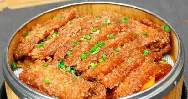 3、切点芋头放入竹笼中,再给他铺上五花肉。锅中加入适量的清水,放上篦子,放上五花肉蒸40分钟时间后再撒上葱花,美味即成。
