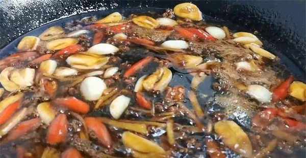5、锅预热,加入适量食用油,放入花椒一小把,再放入小米椒和姜蒜片翻炒。用小火煎至香气释放。炒香后,加入一小碗生抽,约30分钟。250克,然后加入半碗香醋,约。130克,糖一勺,素蚝油一勺,小火煮滚,熄火待用。