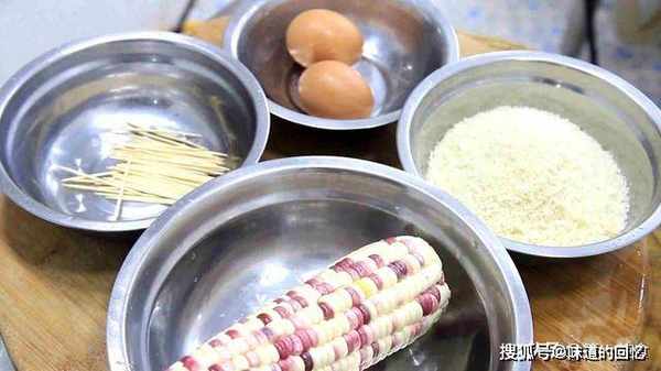 1.首先我们准备一下食材:一把牙签,一个黏玉米,两个鸡蛋和适量的面包糠。