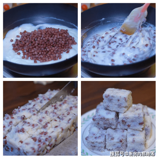 2、开小火不停地搅动,粘稠后倒入煮好的红豆,继续搅匀,然后拿个模具,铺上油纸,再倒入红豆糊,整理平整,定型30分钟。