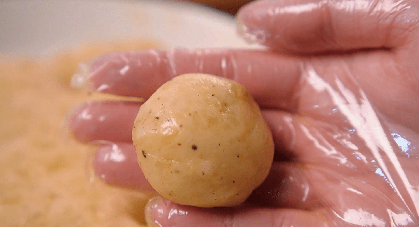 2、加入盐,黑胡椒和玉米淀粉混合均匀,手上抹点油搓成小圆球。
