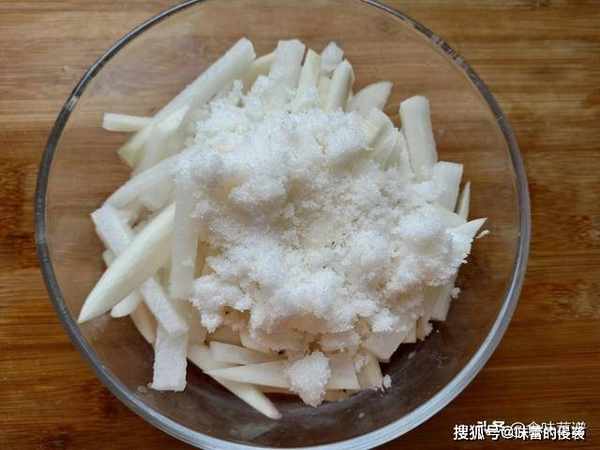 6、时间到了,可以看到萝卜中腌出了不少水份,把水直接倒掉。