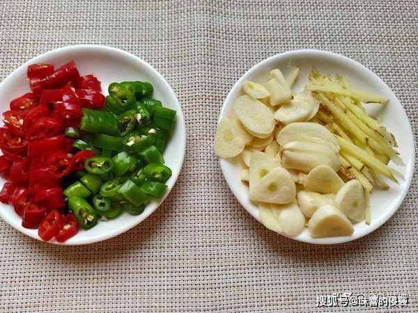 5、空闲时间,可以准备一下配菜,青红椒切成1厘米的圈圈,大蒜切成片,生姜切丝。