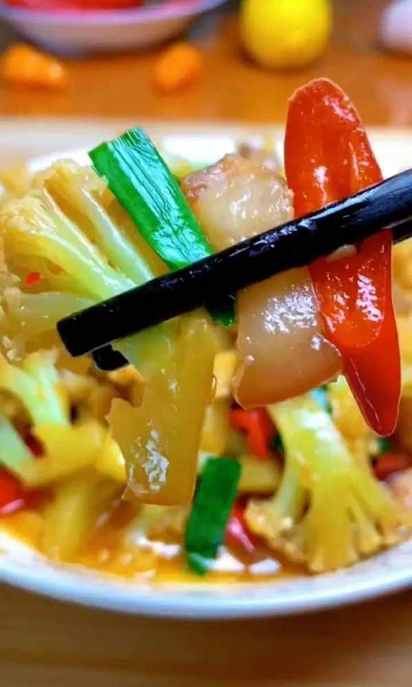 先把花菜切小块烧开水吃,水烧开后浇在花菜汤上,直到断生取出待用。其次,将切好的小块放入油锅中油炸至金黄色后捞出沥去水分备用。另取一锅烧热油,下肉片煸炒出油后下蒜末、干辣椒炒的香,然后下花菜加盐糖生抽蚝油,最后放入一些小米辣,蒜苗,随意炒几下,就可以出锅了。