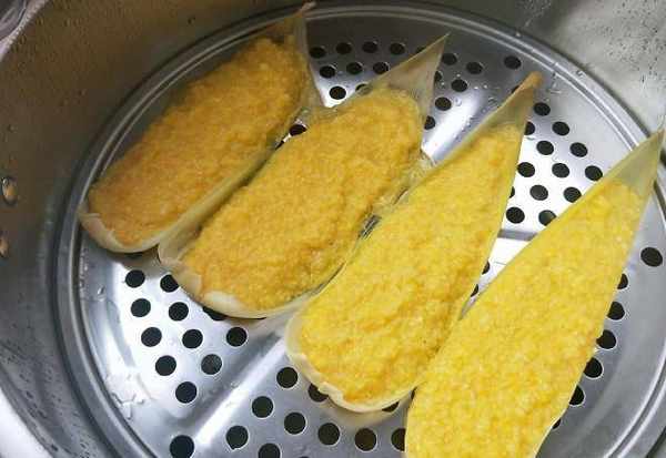4锅里放水,水煮开后,把装有玉米叶的玉米面糊来蒸。